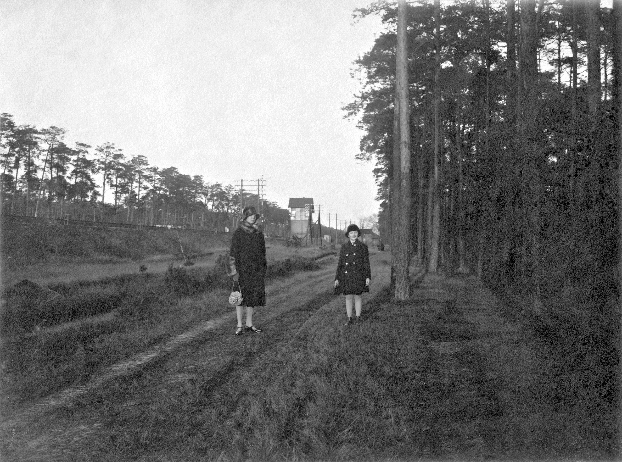 mindestens ein Telegrafenmast, ein dunkler Wald