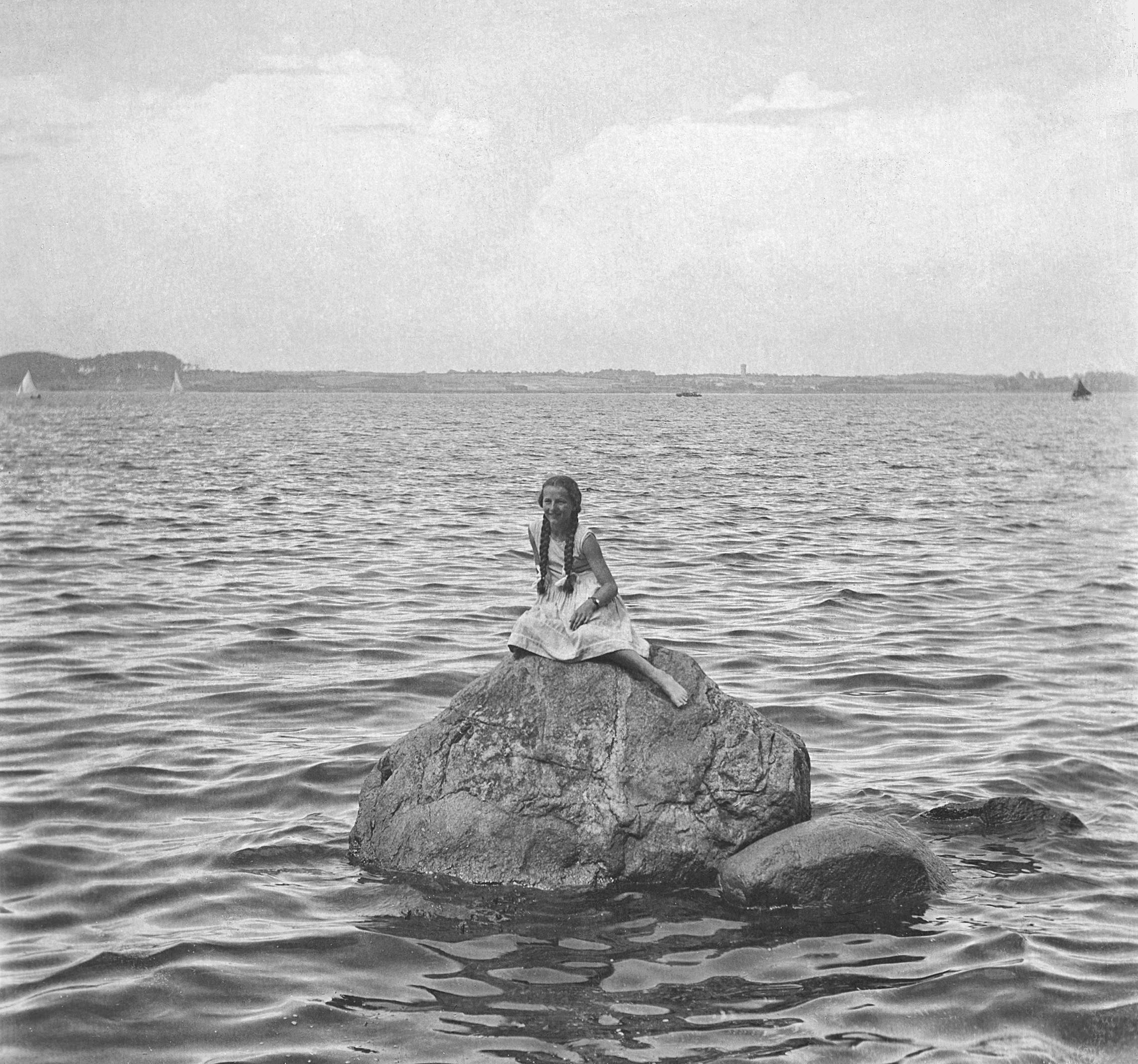 Andersen. Erfrischend zu sehen, dass auch andere Fotografen und Models - und nicht nur ich - bei solcherlei romantischen Jugendstil-Fotos die Armbanduhr vergessen. ;) Aber auch eine kleine Meerjungfrau soll natürlich immer wissen dürfen, wie spät es ist. Klar, warum auch nicht? Früher war mehr Uhr, heute ist mehr Smartphone! Der Künstler der berühmtem Skulptur von 1913 wurde ja durch Jeanne d'Arc inspiriert (Wikipedia - Kleine Meerjungfrau) und das Foto hier ist dann wiederum von der Kopenhagener Skulptur inspiriert. Damals war man noch sehr romantisch geprägt und man wollte somit eben auch solch verträumte Märchenszenen nachstellen, heute würde man wohl nicht mehr die etwas altmodische "Jeanne d'Arc - Meerjungfrau" nachahmen, sondern vielleicht eher die aus modernen Zeiten berühmte Jeanneke Pis aus Brüssel, wobei ihr älterer Bruder ja noch etwas berühmter ist. So ändern sich halt die Zeiten, die Märchenerzählungen und Hommagen... Dies ist auf alle Fälle ein - mit viel Restaurationsarbeit - sehr schönes Bild aus dem Jahre 1933! Die Zahl war auf der ansonsten stark mit braunen Papierresten verklebten Rückseite noch zu lesen. Anhand weiterer kleiner Stellen mit noch sichtbaren Textstrichen war klar, dass da noch mehr unter den Kleberesten stand. So begann ich, mit einer Messerklinge alles vorsichtig abzuschaben - und jaaa, da kamen tatsächlich noch Wörter lesbar zum Vorschein! ich fühlte mich, wie sich wohl Archäologen bei Ausgrabungen fühlen werden, wenn sie tief in der Lehmerde beim Abschaben der Schichten dann auf gut erhaltene mittelalterliche Nachttöpfe u.ä. persönliche Gegenstände stossen und diese für eine Museumspräsentation freilegen. Also da kam dann hier bei mir als erstes zum Vorschein: "Sommer 1933". Es steht auch noch ein Wort darüber, dass da aller Wahrscheinlichkeit und Interpretation nach lautet: "Hanning". Das könnte der Ort sein. Allerdings gibt es keinen Ort "Hanning", erst recht nicht am Wasser. Es könnte auch "Haiming" heissen. Ein "Haiming" gibt es am Innspitz, aber nach Flusseinmündung sieht das hier nicht aus, auch zeugt der Stein und die Meerjungfrau-Szene eher von skandinavischen Gewässern mit Schären. Oder vielleicht irgendwo um die Ostsee. Vielleicht ist "Hanning" gar kein Ort, es kann ja auch ihr Spitzname sein. Dann steht noch drunter: "Für die liebe Jille" (oder "Gille"). Der Logik nach hat also jemand dieses Foto mit der Widmung verschenkt und derjenige/diejenige, der/die es bekommen hat, hat es dann gründlich ins Album eingeklebt. Jetzt ist es hier so gut als möglich digital aufbereitet zu sehen. :) |