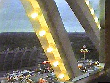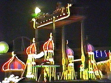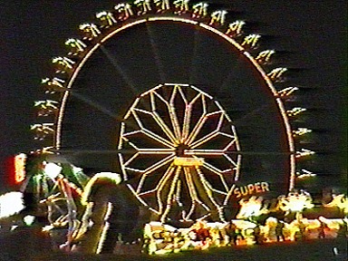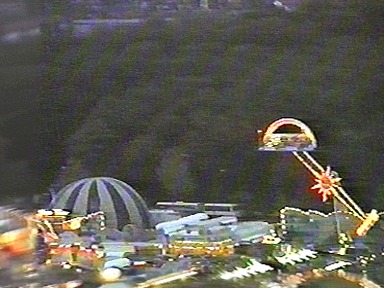 . Wie '85, auch hier wieder Riesenrad und fliegender Teppich. Links dahinter im Dunkel ein Bogen der Achterbahn, rechts hinten das "Eis" der Eislaufhalle. . freimarkt-1986-riesenradfahrt-h264.avi 270 MB 5:45 min 384x288 Codec: H264 . |