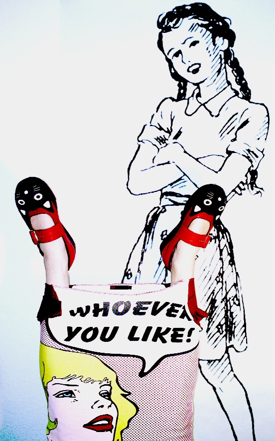 Reine Naturlederschuhe sind mir manchmal 'n bisschen zu grün-alternativ, Turnschuhe zu bräsig, bis auf Chucks, aber die hatte ich früher schon jahrelang an und will die jetzt nicht mehr, die Asics würden vielleicht noch gehen, aber die sind ja schon 'n bisschen out jetzt. Für Campers bin ich nicht so ganz die Szene. Doc Martens finde ich gut, aber auch die sind entweder 'n Tick zu rechts oder zu links (hin und wieder gibt's da mal was Tragbares). Schickimicki oder Trekking ist auch nicht so ganz meine Identität und passt auch nicht zu jedem Anlass... und alles Andere ist - für meinen Geschmack - entweder zu uniform oder viel zu durch- schnittliche Massenware. Hmm.. schwierig eben. Irgendwann stiess ich mal auf die TUK Cats und sage: Die sind Kult! Sie sind zu allem kombinierbar! :) Passen auch gut zu farbigen Socken. Muss man natürlich immer mit rechnen, drauf angesprochen zu werden - und wird man auch. Bietet Gesprächsfaktor. Sie sind super bequem, weil ganz aus Gummi, da scheuert nix! Und auch für kälteres Wetter gut geeignet, Vollgummi isoliert gut und hält warm und wasserdicht. --------- Die Reni im Hintergrund ist eine Buchillustration aus den 50er Jahren von Lotte Wittig, die ich mir im Herbst 2005 gescannt, in Lebens- grösse ausgedruckt und dann an die Wand gehangen habe. In der Original-Illu steht Reni vor einer Nachkriegsruine und ist in der Story zuversichtlich, dass es mit Stadt, Staat und Gesellschaft wieder bergauf gehen wird. Hätte 2005 nie gedacht, dass ich ein paar Jahre später so eine mal als Ava haben werde. :-D Sie hatte sich sozusagen schon "angekündigt"... ;) Das Pop-Art-Roy-Lichtenstein-Teil ist ein T-Shirt, mir zum Tragen aber zu klein. |