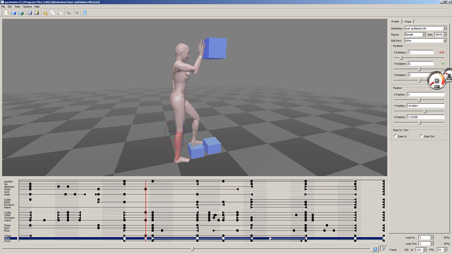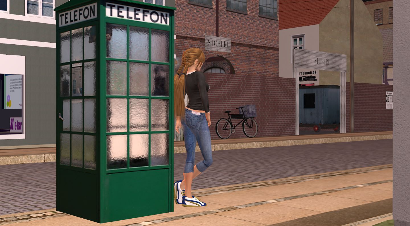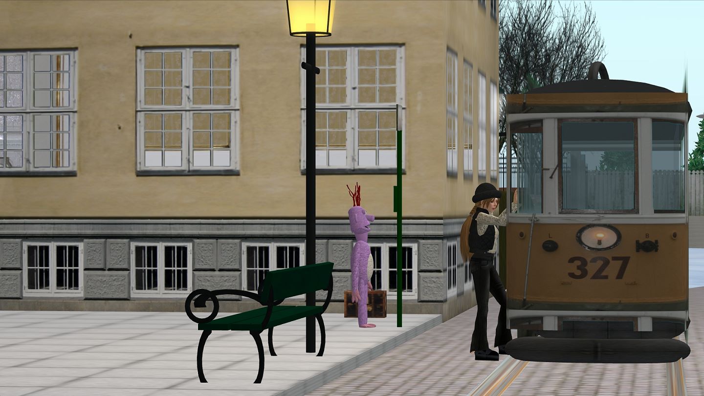 Posen .. Da der Strassenbahnwagen als ein "Phantom" gebaut ist, kann man sich nur auf die Sitze klicken - und so springt man dann von draussen auf den entsprechenden Poseball-Platz. Ansonsten ist die Bahn durchlässig, d.h.man läuft einfach durch sie hindurch als wäre sie nicht da. Und steht man in der Bahn, die innen eine erhöhte Fussboden-Plattform hat, so steht man etwa kniehoch im Boden drin. Das fand ich wenig attraktiv für eine Einstieg-Sequenz. Ich hätte also nur vor der Bahn stehenbleiben können, um in der nächsten Szene bereits drin zu sitzen. Da wir nun gerade in der SL-Schule einen Kurs hatten, in welchem wir gelernt haben, Posen zu erstellen, habe ich mich da mal rangewagt, selbst eine passende Einstiegspose zu animieren. Insgesamt besteht das Einsteigen und Hinsetzen aus drei sepearten Posen, für dann jeweils eine eigenständige Filmszene: 1. Tür aufziehen und hochsteigen 2. In Bahn um 90° in den Gang drehen 3. Durch den Gang laufen, seitlich vor den Stuhl gehen und hinsetzen Erstmal hiess es die Bodenhöhe im Wagen auszupeilen und den Animationsdummy für die Laufszene im Wagen um dieses Stück hochzustellen, denn in der Tram soll Steffy ja direkt auf dem Fussboden laufen, was in diesem Fall einem "Gehen in der Luft" entspricht. Animationen laufen in SL überall und immer mit fester Höhenposition ab (zumindest wenn man keinen Poseball hat, in den man die Ani reinpackt - und einen eigenen Poseball kann ich dort in der Landschaft nicht positionieren, weil man ja, wie allermeist auf fremdem Land, keine "Baugenehmigung" hat). Dieses Prog hier ist nur sehr simpel aufgebaut und das ist 'n bisschen blöd. Man kann z.B. kein Körperteil von den Koordinaten her in der Umwelt "festnageln", ja nicht mal ein einzelnes Körperteil in den nächsten Bildern immer wieder gleich in seinen Zahlenwerten festlegen (nur den ganzen Body in seinen xyz-Achsen). So muss man also immer alle Körperteile neu ausrichten. Z.B. geht der Körper beim Einsteigen im Ganzen etwas vor, die Hand am Griff kann man nicht fixieren, sondern Arm und Hand gehen mit vor - und man muss sie wieder zurückziehen und neu und wieder möglichst optisch deckungsgleich zu vorher einstellen. Wenigstens kann man Formen zur rein optischen Orientierung positioneren (die blauen Würfel). Bei dem 3D-Prog "Truespace" kann man sog. "Nägel" direkt in die einzelnen Körperteile setzen und die Figur somit an einem selbst gewählten Fix- und Kontaktpunkt zwischen Body und Umwelt neu ausrichten, ziehen und drehen. Immerhin berechnen solche Programme gegenüber echtem Knetmännchen-Trickfilm beliebig viele Zwischenbilder, aber das sollte logisch sein. Schade auch, dass man die Finger nicht bewegen kann. Etwas zu greifen wäre schon ganz schön. Man kann lediglich beim Hochladen der Animation einstellen, ob man eine Faust oder eine flache Hand haben will. Alles also sehr anachronistisch. Ballettanz, Breakdance oder Barrenturnen lässt sich damit nicht machen, nur so einfaches Winke-Winke oder statische Posen eben. Hier erforderte das Laufen mit dem seitlichen Gehen vor den Stuhl und dem Hinsetzen schon ziemliche langwierige Puzzlearbeit. Sehr oft werde ich daher wohl keine Anims mehr machen... Und lieber habe ich beim Erstellen der Ani auf sehr viele Zwischenbilder eingestellt, was dann zwar zum Zeitlupenablauf der Bewegung führt, die Bewegung aber weicher macht, als stattdessen in Echtzeit zu animieren, was dann die Bewegung wegen nur wenigen Zwischenbildern eher rauh ausehen liess. So habe ich lieber hinterher die fertige Filmsequenz beschleunigt und konnte mit unterschiedlichen Tempi experimentieren in den Abschnitten "laufen", "vor den Stuhl gehen", "hinsetzen". Die Zukunft zur Animationserstellung von eigenen Ava-Gesten wird ganz sicher in sowas wie den Konsolen-Spielsteuerungen liegen! Bewegungserkennung via Wii oder Kinetic. Dann heisst es einfach 1-3 Cams aufstellen, dazu 1-2 "Zepter" in die Hand nehmen...und ab geht die Luzie und gleich räumlich 1:1 auf den Rechner rauf. Jedenfalls werden all die komplexen Moves in Second Life, wie z.B. die Disco-Tänze, wohl zumindest mit vollverkabeltem Körperanzug oder sowas entstanden sein, aber ganz sicher nicht mit so einer Knetgummi-Dummy-Figur wie hier. Da ja nun die Bahn gar keine Tür zum Aufziehen hat = die Aussenwand bleibt dicht, kann ich ihren Einstieg nur von der Seite aus, in nur fast einer Flucht mit der Aussenwand drehen. Damit nicht auffällt wie sie durch die Wand hindurch geht. |